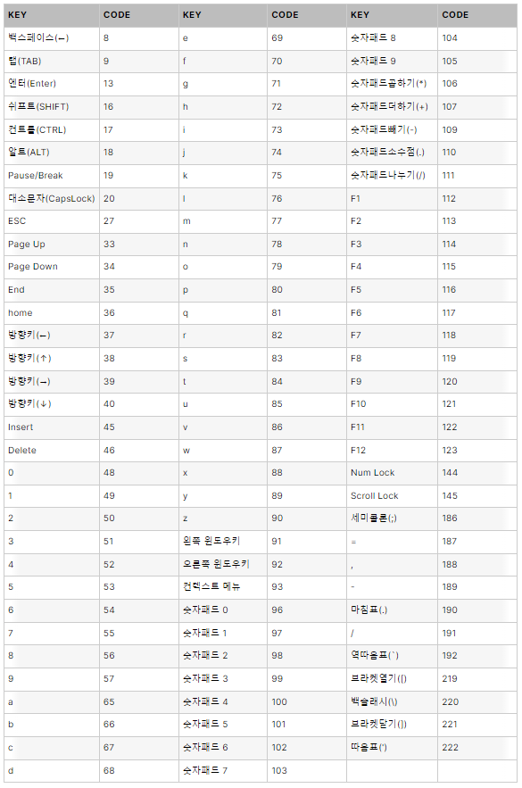 자주 사용되는 keyCode 값은 다음과 같습니다.